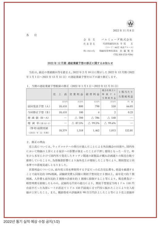 영업이익은 기초 8억엔에서 1억엔까지 예상을 하향 조정했다. 원인은 기록적인 엔화에 따른 구매 원가 상승이라고 한다. 광고 선전비나 연구비, 인건비 등을 억제했지만, 기초 예상 책정 당시는 1달러 110엔대 전반이었던 환율이 1달러 150엔 전후까지 상승. 매출원가율이 62.6%에서 68.9%로 올라갈 전망이 된 것이 요인이다.