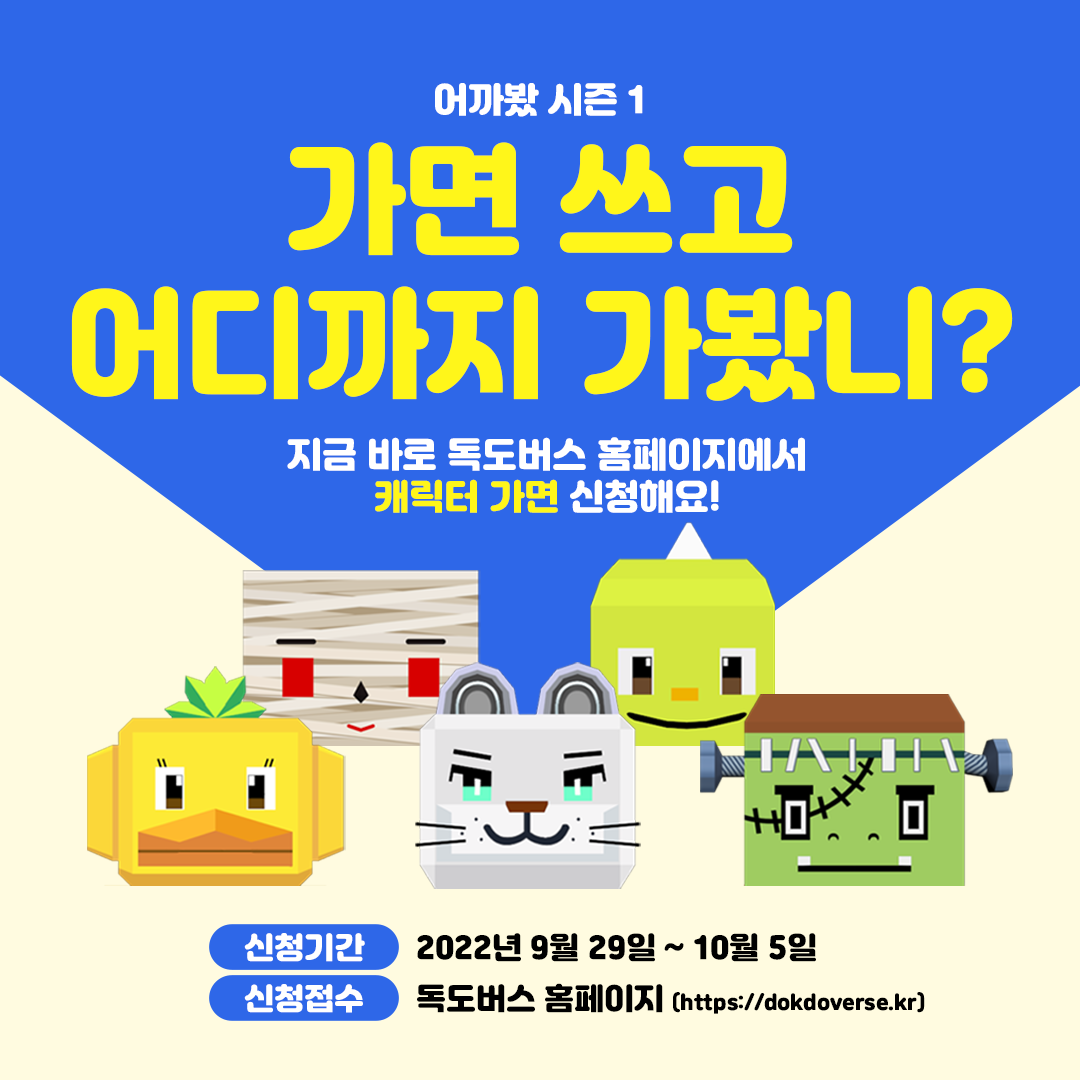 독도버스는 메타버스와 현실을 연결하는 이벤트를 굉장히 많이 하고 있는데, 지난 9~10월에는 독버 케릭터로 가면을 만들어 배포하기도 했다. 현재 독버 가면을 쓰고 '어디까지 가봤니' 이벤트를 진행 중이기도 하다. 이벤트는 독도버스 가면을 가지고 있는 사람들을 대상으로 했는데, 어디든 가서 인증을 하고 SNS에 올리면 응모된다.