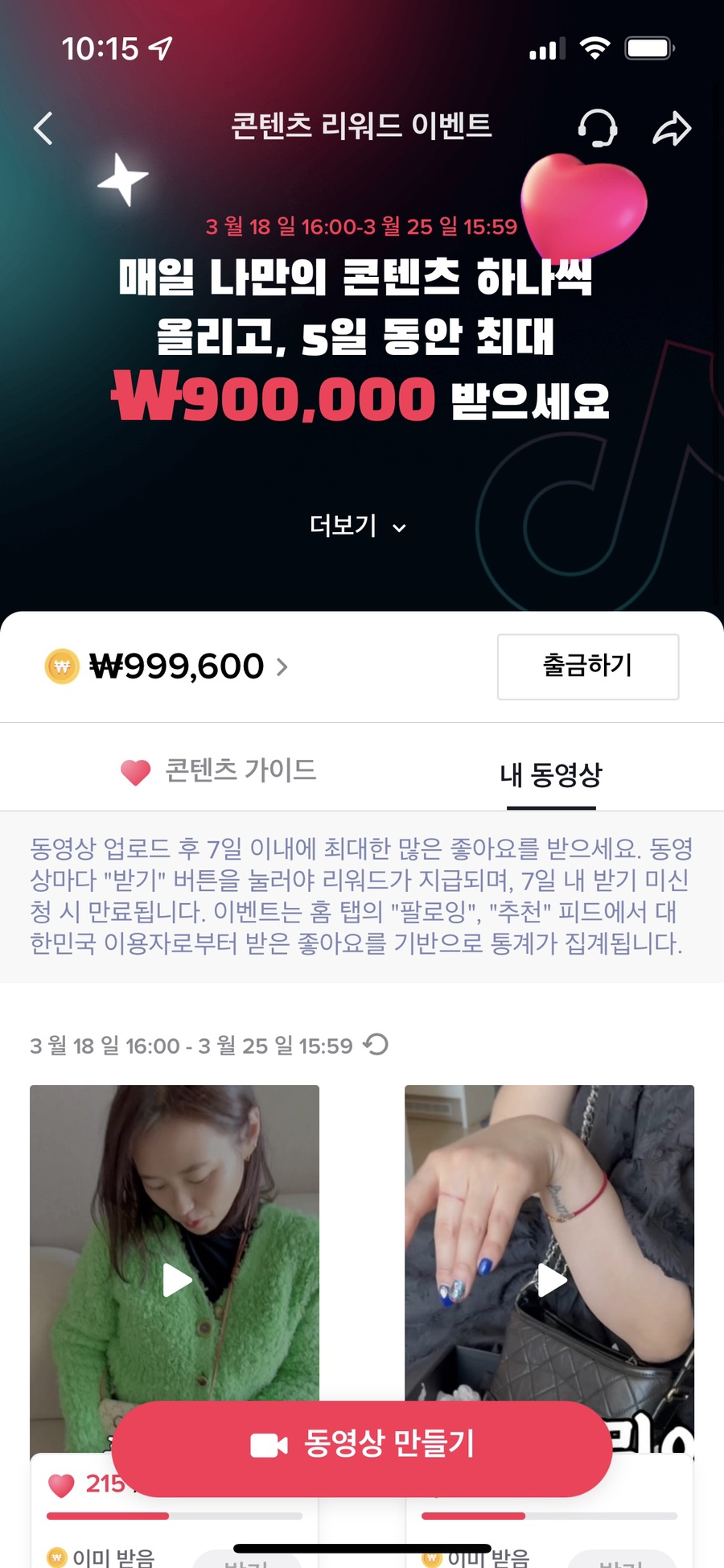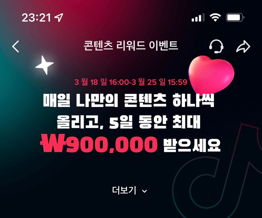 이 글은 틱톡으로 이전에 쓴 도전기입니다. (3월작성) 실제 100만원 번 후기는 다음 글에서 확인해주세요 !!! 틱톡 시작했어요! 마침 틱톡 콘텐츠리워드 이벤트도 하고 있더라구요 최대 81만원 벌